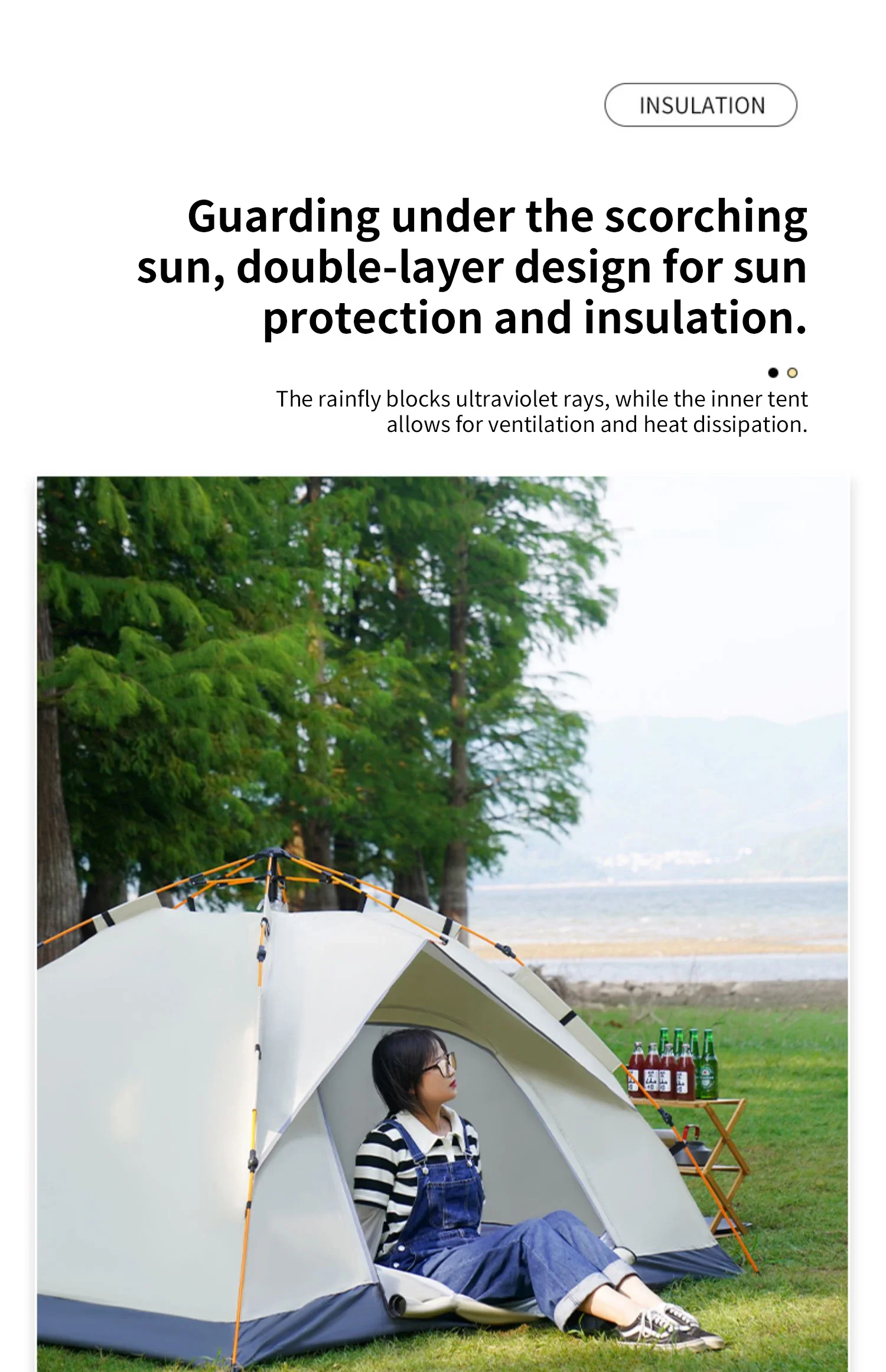 3.Insect-proof, breathable, and sun protection: The tent features a double-door design with high-density mesh, ensuring better mosquito and insect prevention while maintaining ventilation inside and outside the tent.